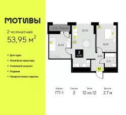 Продается 2-комн. квартира с предчистовой отделкой в ЖК "Мотивы" на 12 этаже. Общая площадь: 53.95 кв.м., жилая: 24.24 кв.м., площадь просторной кухни-столовой: 20.1 кв.м. Комнаты изолированные, все окна выходят на одну сторону. В квартире одна лоджия, один совмещенный санузел. Высота потолков 2.7 м.