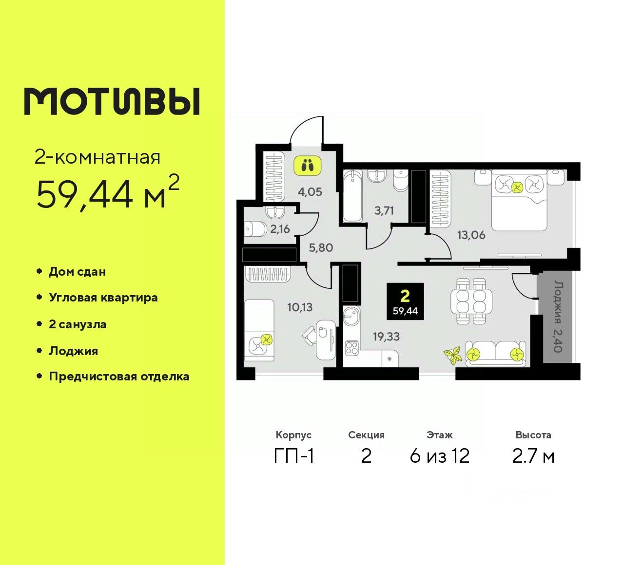 Продается 2-комн. квартира с предчистовой отделкой в ЖК "Мотивы" на 6 этаже. Общая площадь: 59.44 кв.м., жилая: 23.19 кв.м., площадь просторной кухни-столовой: 19.33 кв.м. Угловая квартира, окна oбecпeчивaют paвнoмepнoe ocвeщeниe в тeчeниe дня. В квартире одна лоджия, один совмещенный и один раздельный санузел. Высота потолков 2.7 м.