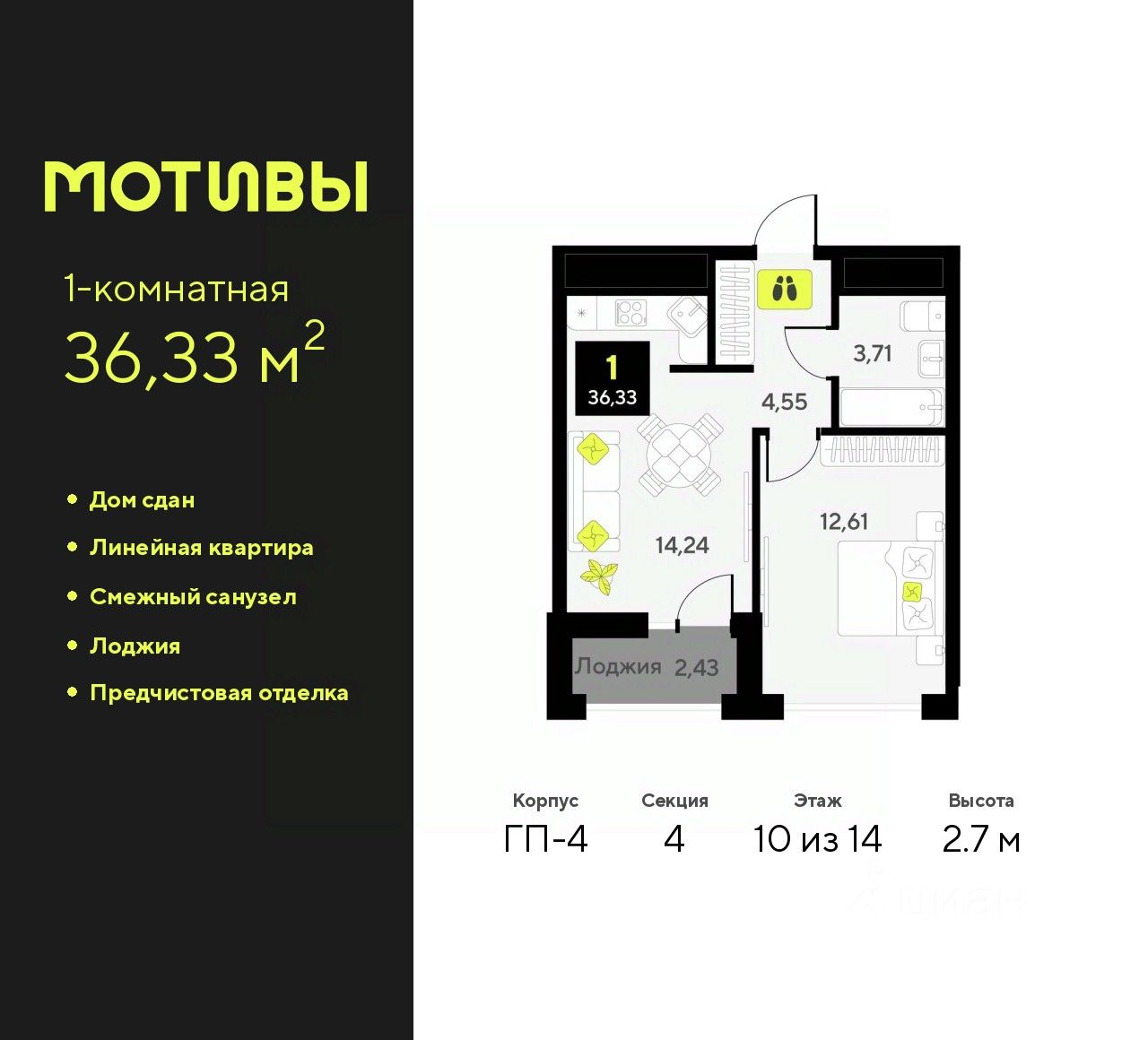 1-комн. квартира от застройщика с предчистовой отделкой в ЖК "Мотивы" на 10 этаже. Общая площадь: 36.33 кв.м., жилая: 12.61 кв.м., площадь просторной кухни-столовой: 14.24 кв.м. Все окна выходят на одну сторону. В квартире одна лоджия, один совмещенный санузел. Высота потолков 2.7 м.