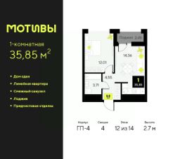 Продается однокомнатная квартира с предчистовой отделкой в ЖК "Мотивы" на 12 этаже. Общая площадь: 35.85 кв.м., жилая: 12.01 кв.м., площадь просторной кухни-столовой: 14.36 кв.м. Все окна выходят на одну сторону. В квартире одна лоджия, один совмещенный санузел. Высота потолков 2.7 м.