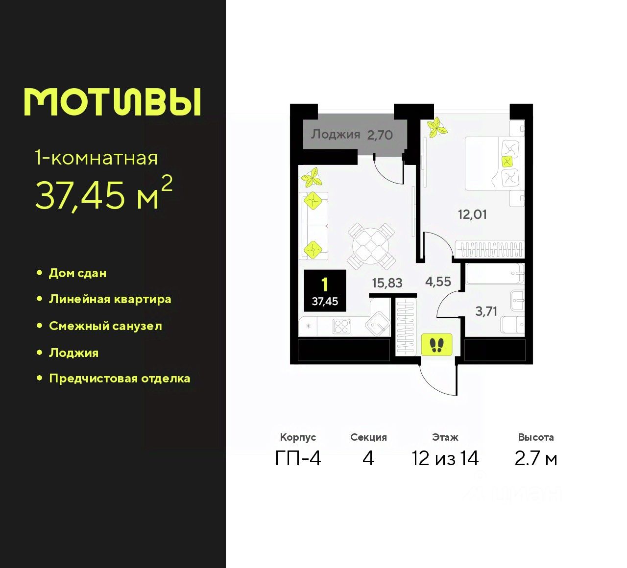 Продается 1-комн. квартира с предчистовой отделкой в ЖК "Мотивы" на 12 этаже. Общая площадь: 37.45 кв.м., жилая: 12.01 кв.м., площадь просторной кухни-столовой: 15.83 кв.м. Все окна выходят на одну сторону. В квартире одна лоджия, один совмещенный санузел. Высота потолков 2.7 м. Квартира будет сдаваться с предчистовой отделкой White Box: выровнены и оштукатурены стены, проведено электричество и отопление, установлены радиаторы. Вы также можете приобрести квартиру с ремонтом от застройщика, представленным в трех цветовых решениях Scandi, Wood и Coffee и включающим ламинат, обои под покраску, двери, натяжной потолок и санузел с сантехникой. При желании вы можете заказать отделку под ключ, варианты возможных решений представлены в альбоме фотографий. Дом монолитный, многоподъездный, переменной этажности, от 5 до 14 этажей. Квартира находится в 4-й секции высотой 14 этажей в корпусе ГП-4. На этаже 12 квартир. В подъезде 1 пассажирский и 1 грузовой лифт. Строительство завершено, дом сдан в 4 квартале 2024 года. Оформление сделки по договору купли-продажи. Закрытая от автомобилей территория, безопасный двор и камеры видеонаблюдения - гаранты вашего спокойствия. Квартал будет располагать богатой инфраструктурой: на первых этажах разместятся магазины, пекарни, кофейни, пункты выдачи, аптеки, детские центры, цветочные салоны и многое другое, что сделает жизнь поистине комфортной. Рядом находится парк общей площадью почти 5000 м², в котором располагаются локации для игр и отдыха жителей, здесь можно совершить утреннюю пробежку или прогуляться после рабочего дня. В парке есть зона воркаута с тренажерами для взрослых, игровые комплексы с горками и канатный комплекс для детей разных возрастов, качели и лавочки для отдыха, площадки для командных видов спорта и для панна-футбола. В ЖК "Мотивы" всё продумано до мелочей: светлые холлы входных групп, оформленные в едином стиле, просторные колясочные, лапомойки для питомцев. На территории комплекса находятся 2 8-ми этажных паркинга и более 1000 м/м на открытой парковке. Жилой комплекс находится в одном из экологически благоприятных районов Тюмени, недалеко от Плехановского бора. При этом до центра города можно добраться за 15 минут, а до международного аэропорта Рощино за 13 минут. Окончание строительства: ГП 1, 2, 3, 4 сдача до конца 2024 года, ГП 6, 7, 8 сдача 2 квартал 2026 года. #2wA87m