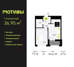 Продается однокомнатная квартира с предчистовой отделкой в ЖК "Мотивы" на 14 этаже. Общая площадь: 36.95 кв.м., жилая: 12.61 кв.м., площадь просторной кухни-столовой: 14.86 кв.м. Все окна выходят на одну сторону. В квартире одна лоджия, один совмещенный санузел. Высота потолков 2.7 м.
