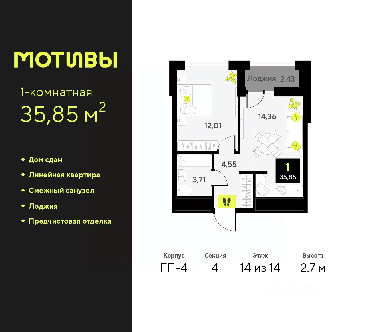 1-комн. квартира с предчистовой отделкой в ЖК "Мотивы" на 14 этаже. Общая площадь: 35.85 кв.м., жилая: 12.01 кв.м., площадь просторной кухни-столовой: 14.36 кв.м. Все окна выходят на одну сторону. В квартире одна лоджия, один совмещенный санузел. Высота потолков 2.7 м.