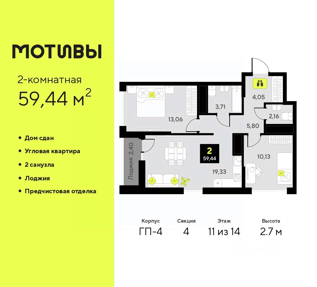 Продается двухкомнатная квартира с предчистовой отделкой в ЖК "Мотивы" на 11 этаже. Общая площадь: 59.44 кв.м., жилая: 23.19 кв.м., площадь просторной кухни-столовой: 19.33 кв.м. Квартира угловая, очень светлая, естественная вентиляция при открытии окон. В квартире одна лоджия, один совмещенный и один раздельный санузел. Высота потолков 2.7 м.