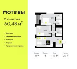 Продается 2-комн. квартира от застройщика с предчистовой отделкой в ЖК "Мотивы" на 11 этаже. Общая площадь: 60.48 кв.м., жилая: 25.48 кв.м., площадь просторной кухни-столовой: 15.02 кв.м. Комнаты изолированные, все окна выходят на одну сторону. В квартире одна лоджия, два совмещенных санузла. Высота потолков 2.7 м.