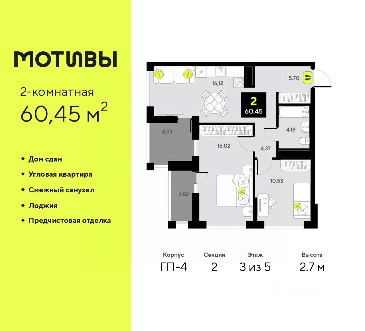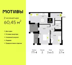Продается двухкомнатная квартира с предчистовой отделкой в ЖК "Мотивы" на 3 этаже. Общая площадь: 60.45 кв.м., жилая: 26.55 кв.м., площадь просторной кухни-столовой: 16.12 кв.м. Квартира угловая, окна oбecпeчивaют paвнoмepнoe ocвeщeниe в тeчeниe дня. В квартире две лоджии, один совмещенный санузел. Высота потолков 2.7 м.