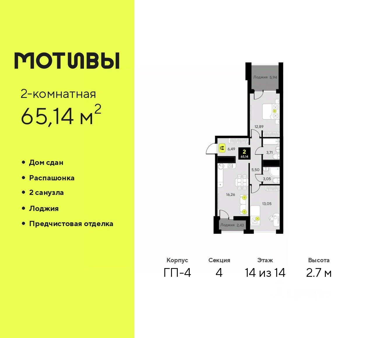 2-комн. квартира от застройщика с предчистовой отделкой в ЖК "Мотивы" на 14 этаже. Общая площадь: 65.14 кв.м., жилая: 25.94 кв.м., площадь просторной кухни-столовой: 16.26 кв.м. Квартира - распашонка, без проходных комнат, окна выходят на paзные стороны дома. В квартире две лоджии, два совмещенных санузла. Высота потолков 2.7 м.