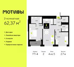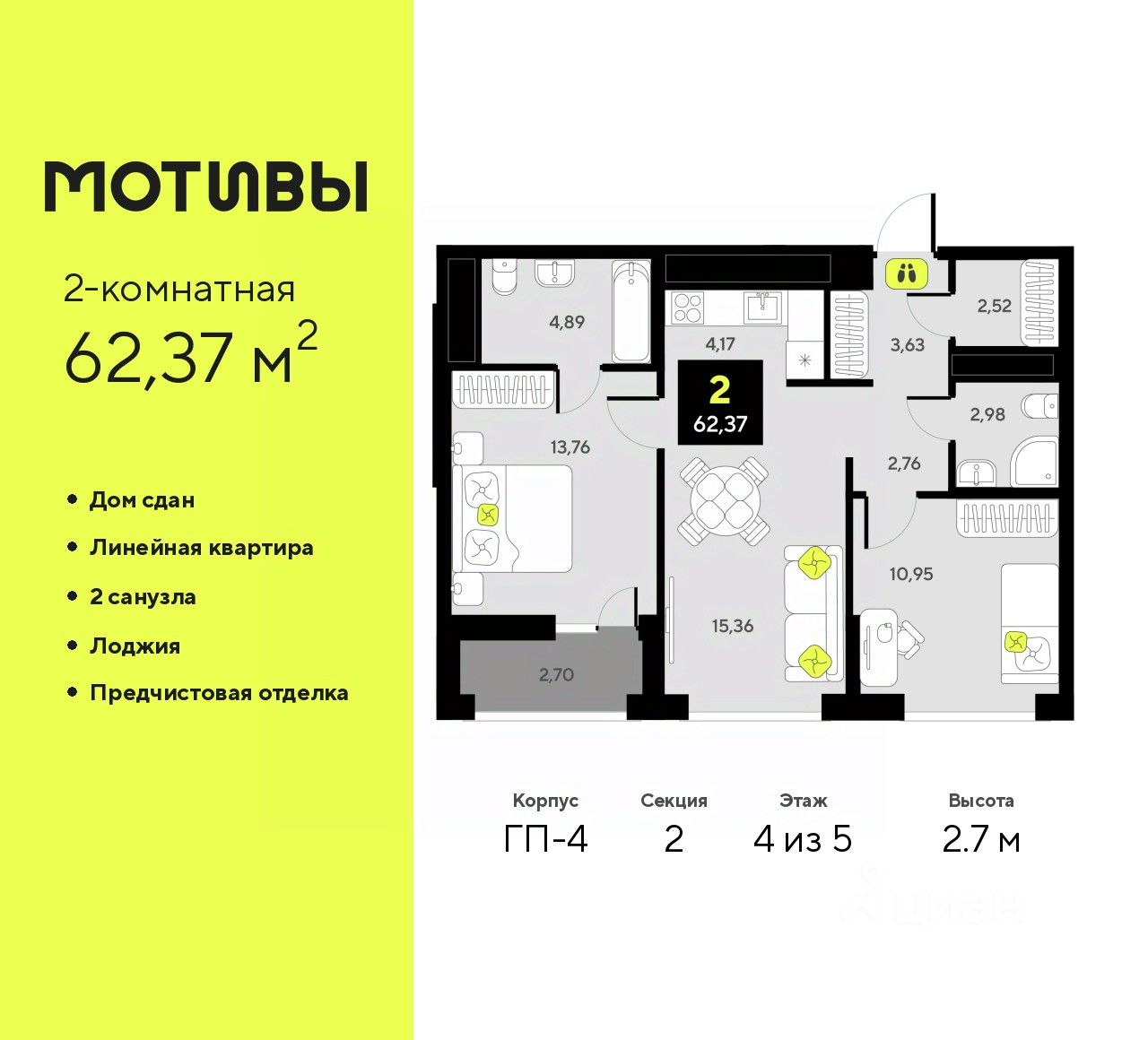 Просторная двухкомнатная квартира с предчистовой отделкой в ЖК "Мотивы" на 4 этаже. Общая площадь: 62.37 кв.м., жилая: 24.71 кв.м., площадь просторной кухни-столовой: 15.36 кв.м. Комнаты изолированные, все окна выходят на одну сторону. В квартире одна лоджия, два совмещенных санузла. Высота потолков 2.7 м.