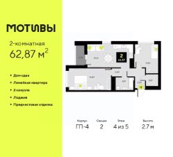 Двухкомнатная квартира с предчистовой отделкой в ЖК "Мотивы" на 4 этаже. Общая площадь: 62.87 кв.м., жилая: 22.16 кв.м., площадь просторной кухни-столовой: 18.73 кв.м. Комнаты изолированные, все окна выходят на одну сторону. В квартире одна лоджия, два совмещенных санузла. Высота потолков 2.7 м.