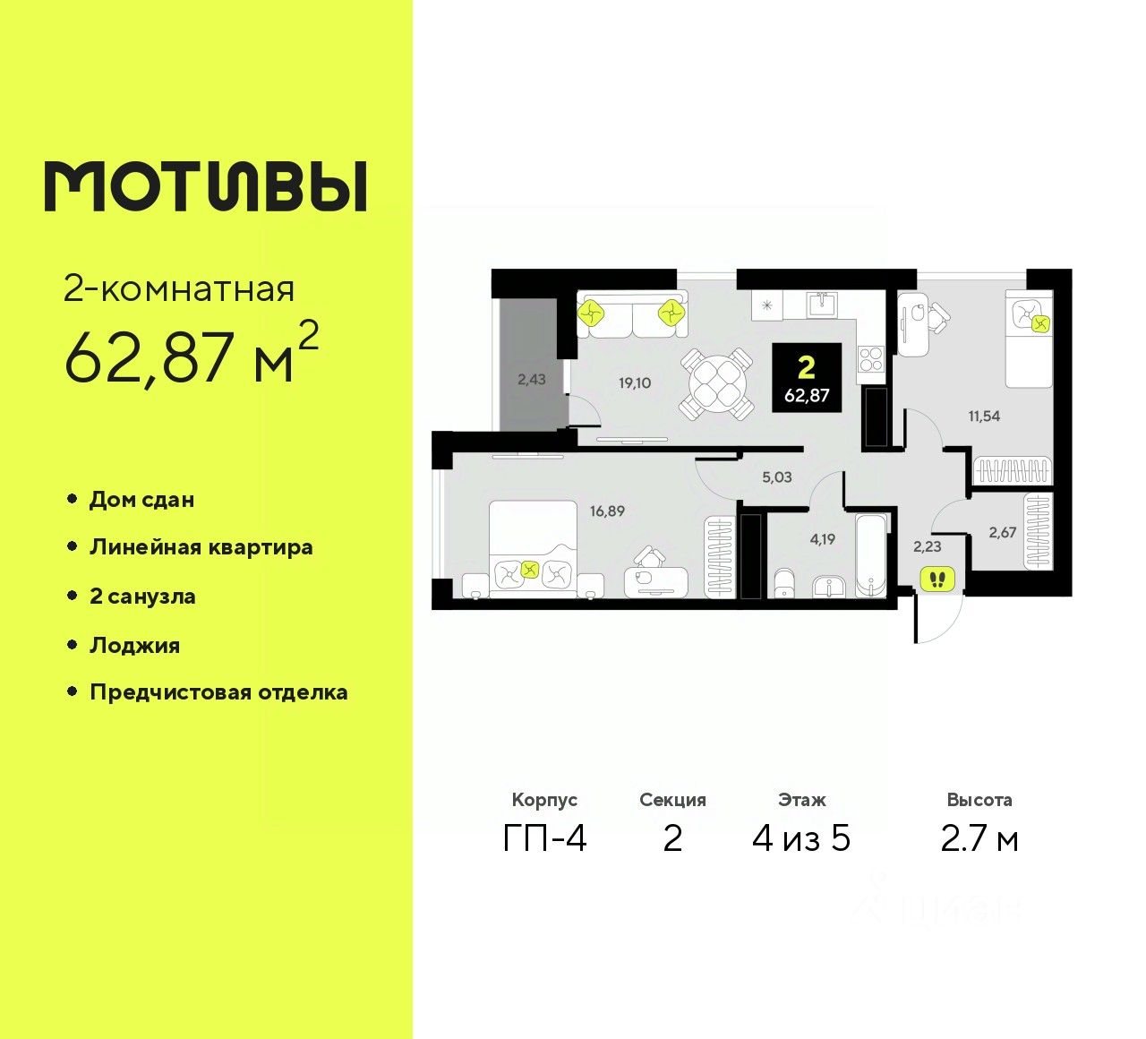 Продается 2-комн. квартира с предчистовой отделкой в ЖК "Мотивы" на 4 этаже. Общая площадь: 62.87 кв.м., жилая: 22.16 кв.м., площадь просторной кухни-столовой: 18.73 кв.м. Комнаты изолированные, все окна выходят на одну сторону. В квартире одна лоджия, два совмещенных санузла. Высота потолков 2.7 м.