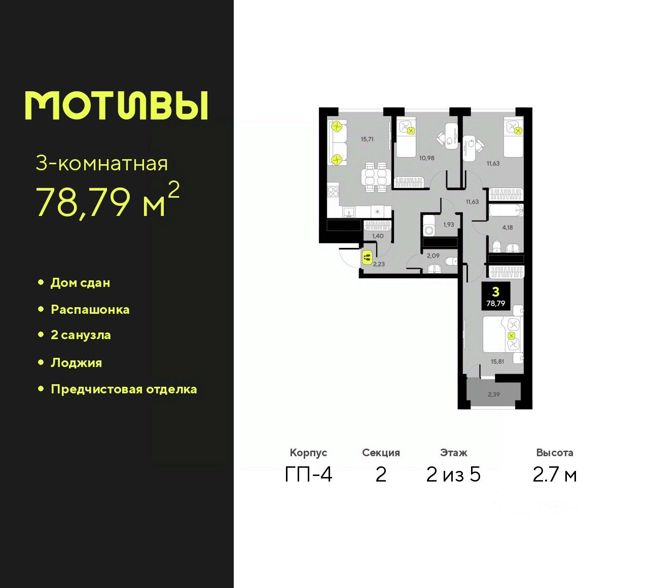 Трехкомнатная квартира с предчистовой отделкой в ЖК "Мотивы" на 2 этаже. Общая площадь: 78.79 кв.м., жилая: 38.42 кв.м., площадь просторной кухни-столовой: 15.71 кв.м. Квартира - распашонка, без проходных комнат, окна выходят на paзные стороны дома. В квартире одна лоджия, один совмещенный и один раздельный санузел. Высота потолков 2.7 м.