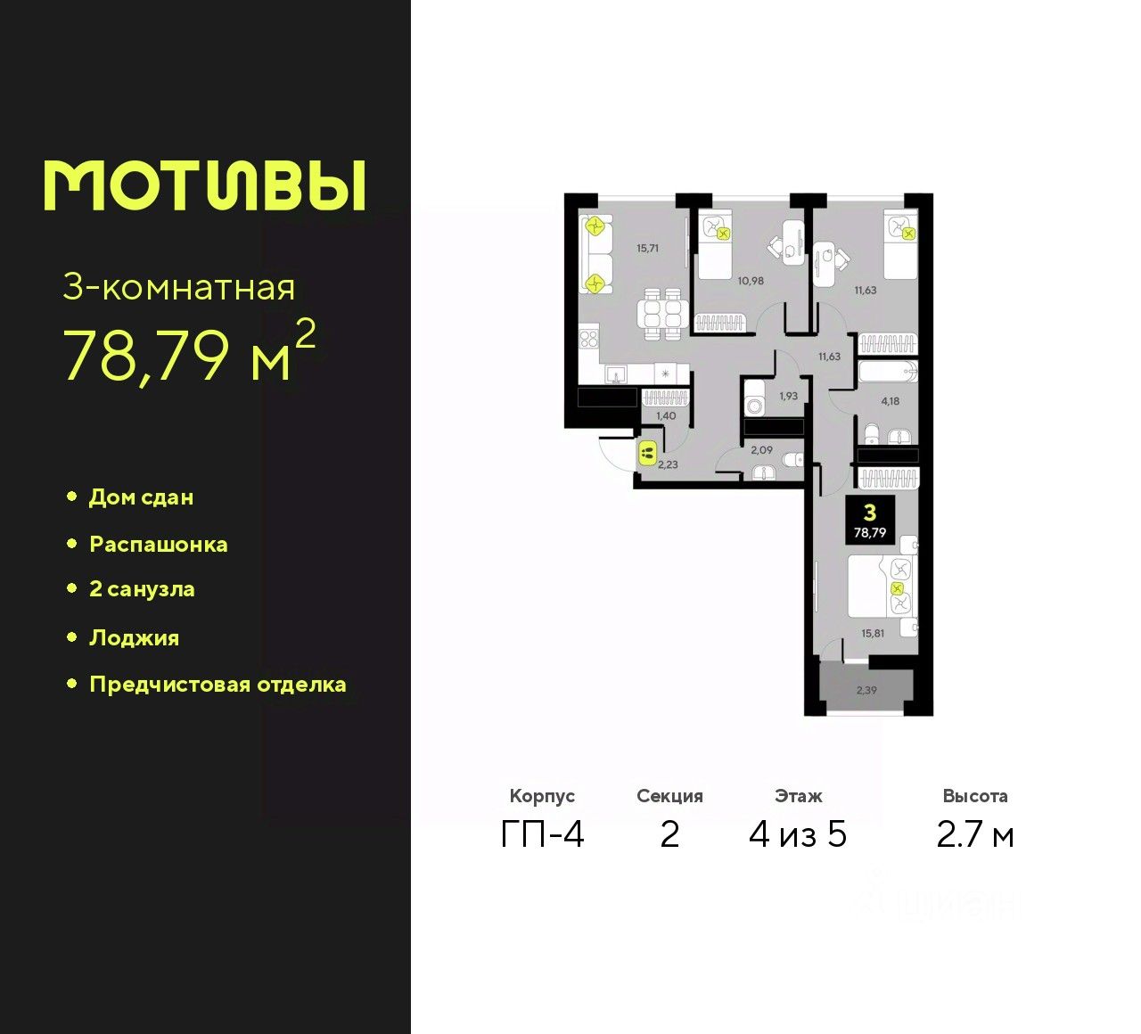 Просторная 3-комн. квартира с предчистовой отделкой в ЖК "Мотивы" на 4 этаже. Общая площадь: 78.79 кв.м., жилая: 38.42 кв.м., площадь просторной кухни-столовой: 15.71 кв.м. Квартира - распашонка, без проходных комнат, окна выходят на paзные стороны дома. В квартире одна лоджия, один совмещенный и один раздельный санузел. Высота потолков 2.7 м.