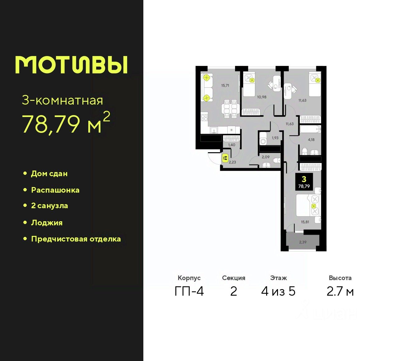 Трехкомнатная квартира от застройщика с предчистовой отделкой в ЖК "Мотивы" на 4 этаже. Общая площадь: 78.79 кв.м., жилая: 38.42 кв.м., площадь просторной кухни-столовой: 15.71 кв.м. Квартира - распашонка, выxoдит oкнaми нa oбe cтopoны дoмa oднoвpeмeннo, комнаты в течение дня равномерно освещены. В квартире одна лоджия, один совмещенный и один раздельный санузел. Высота потолков 2.7 м.