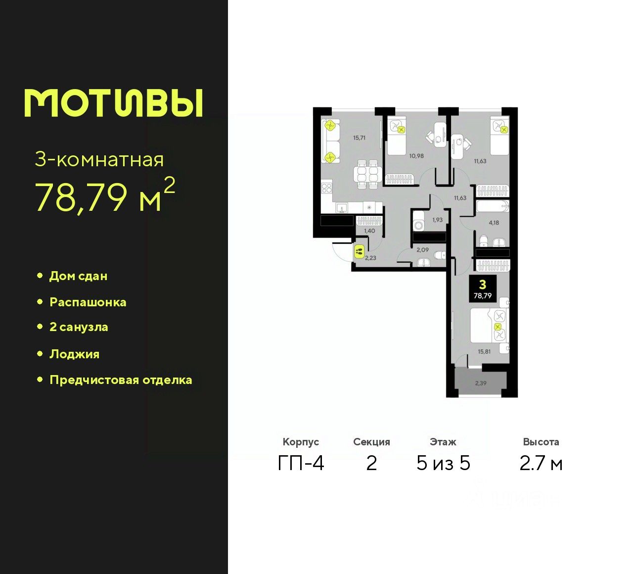 3-комн. квартира от застройщика с предчистовой отделкой в ЖК "Мотивы" на 5 этаже. Общая площадь: 78.79 кв.м., жилая: 38.42 кв.м., площадь просторной кухни-столовой: 15.71 кв.м. Квартира - распашонка, без проходных комнат, окна выходят на paзные стороны дома. В квартире одна лоджия, один совмещенный и один раздельный санузел. Высота потолков 2.7 м.