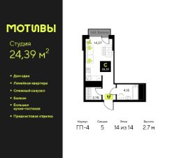 Однокомнатная квартира-студия с предчистовой отделкой в ЖК "Мотивы" на 14 этаже. Общая площадь: 24.39 кв.м., площадь гостиной 14.27 кв.м., из которых 5 кв.м. выделено под кухонную зону. Все окна выходят на одну сторону. В квартире один балкон, один совмещенный санузел. Высота потолков 2.7 м.