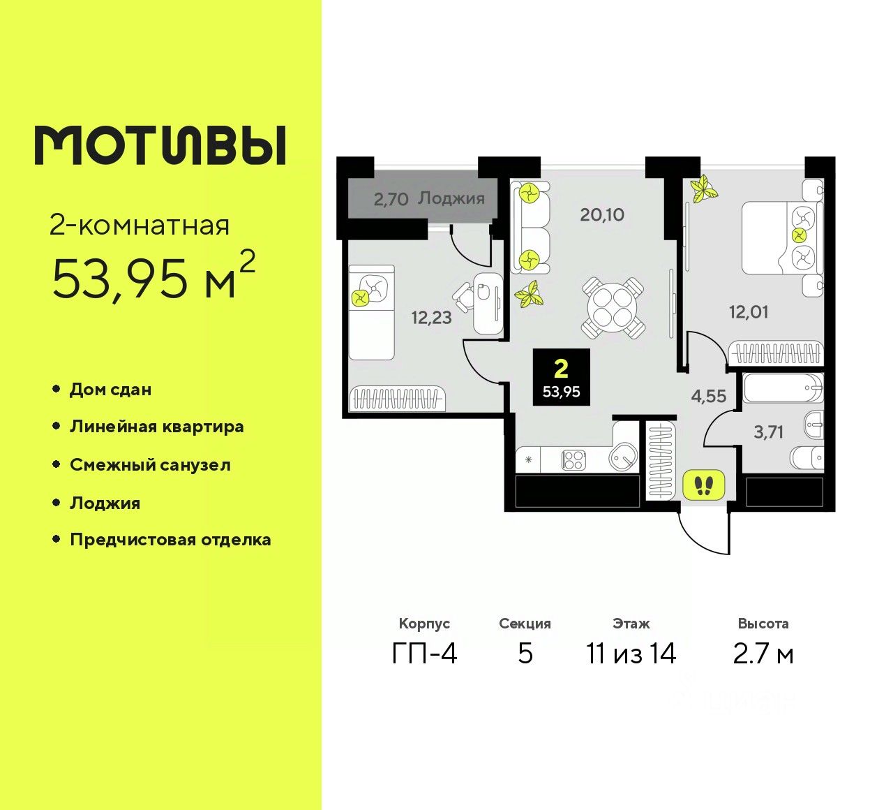 Двухкомнатная квартира с предчистовой отделкой в ЖК "Мотивы" на 11 этаже. Общая площадь: 53.95 кв.м., жилая: 24.24 кв.м., площадь просторной кухни-столовой: 20.1 кв.м. Комнаты изолированные, все окна выходят на одну сторону. В квартире одна лоджия, один совмещенный санузел. Высота потолков 2.7 м.