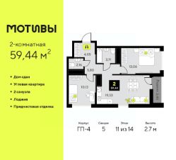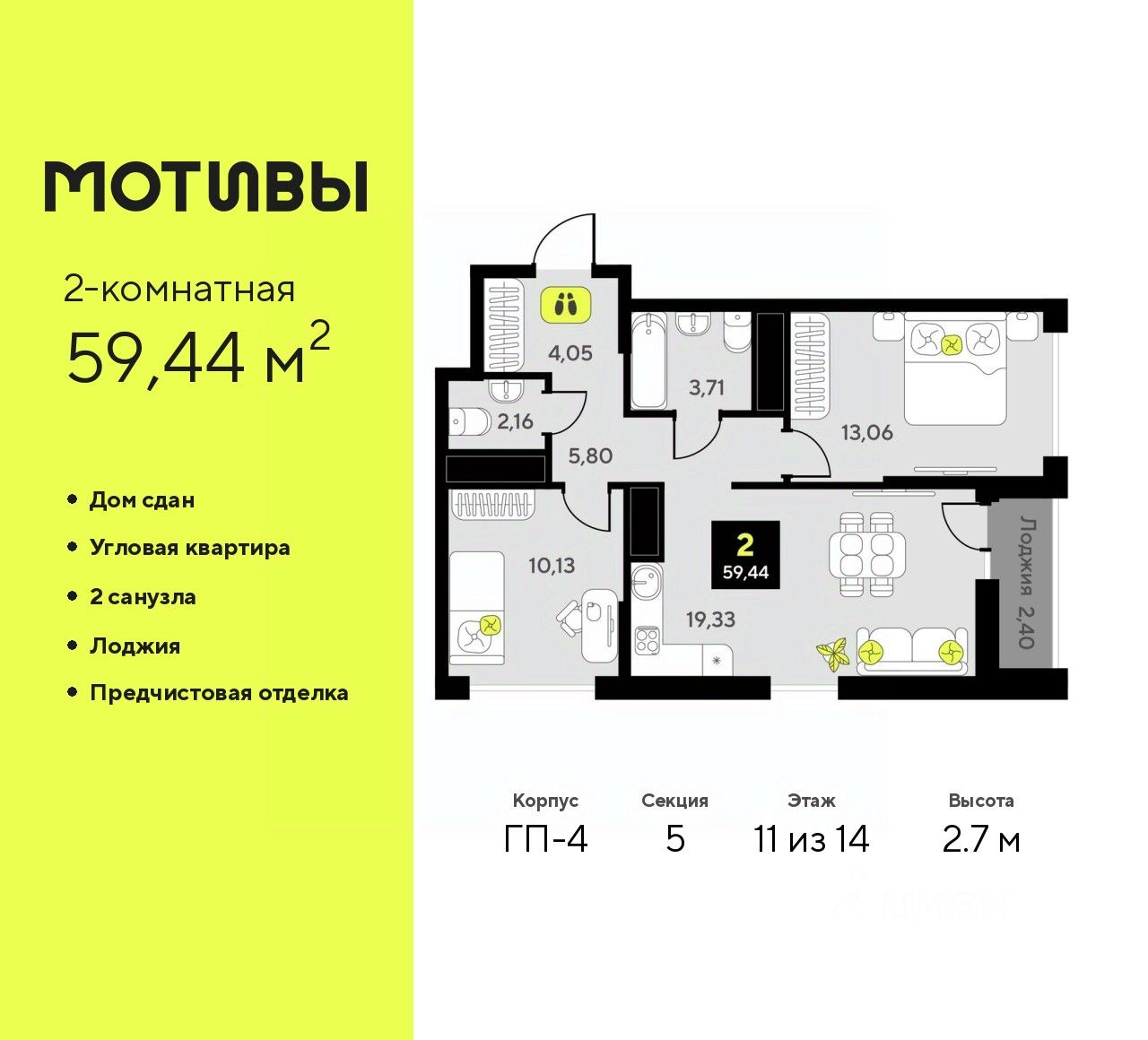 Просторная 2-комн. квартира с предчистовой отделкой в ЖК "Мотивы" на 11 этаже. Общая площадь: 59.44 кв.м., жилая: 23.19 кв.м., площадь просторной кухни-столовой: 19.33 кв.м. Угловая квартира, идеально подойдет любителям тишины и панорамных видов. В квартире одна лоджия, один совмещенный и один раздельный санузел. Высота потолков 2.7 м.