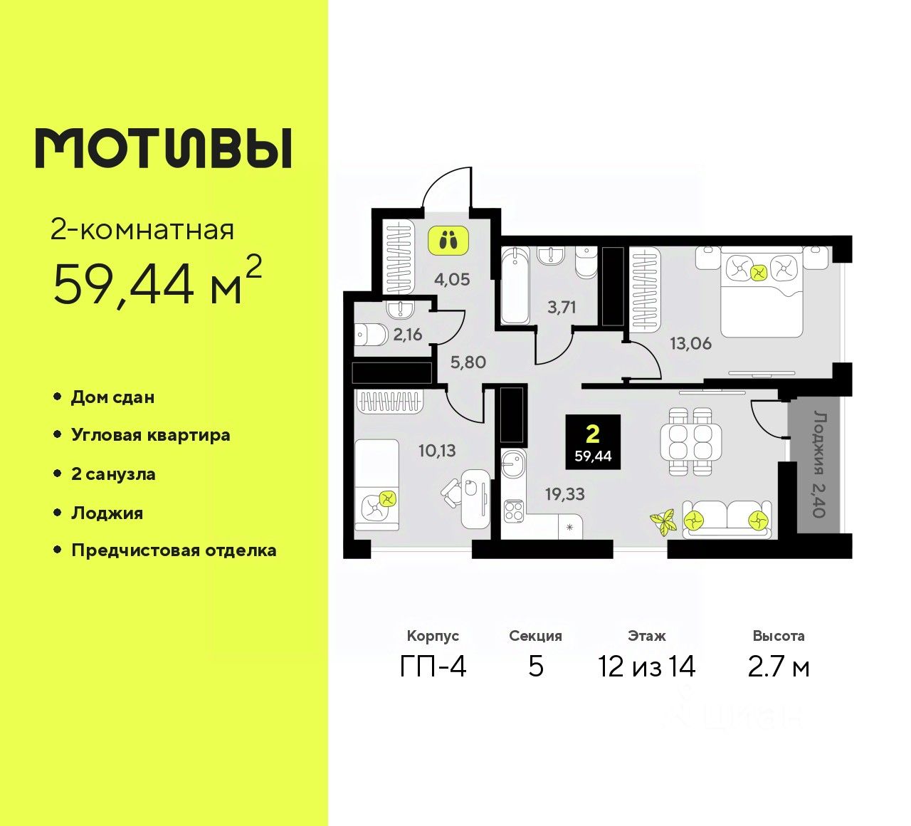 Просторная двухкомнатная квартира с предчистовой отделкой в ЖК "Мотивы" на 12 этаже. Общая площадь: 59.44 кв.м., жилая: 23.19 кв.м., площадь просторной кухни-столовой: 19.33 кв.м. Угловая квартира, идеально подойдет любителям тишины и панорамных видов. В квартире одна лоджия, один совмещенный и один раздельный санузел. Высота потолков 2.7 м.