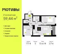 Просторная 2-комн. квартира с предчистовой отделкой в ЖК "Мотивы" на 13 этаже. Общая площадь: 59.44 кв.м., жилая: 23.19 кв.м., площадь просторной кухни-столовой: 19.33 кв.м. Квартира угловая, идеально подойдет любителям тишины и панорамных видов. В квартире одна лоджия, один совмещенный и один раздельный санузел. Высота потолков 2.7 м.