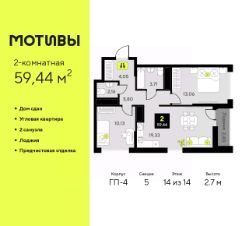 2-комн. квартира с предчистовой отделкой в ЖК "Мотивы" на 14 этаже. Общая площадь: 59.44 кв.м., жилая: 23.19 кв.м., площадь просторной кухни-столовой: 19.33 кв.м. Угловая квартира, очень светлая, естественная вентиляция при открытии окон. В квартире одна лоджия, один совмещенный и один раздельный санузел. Высота потолков 2.7 м.