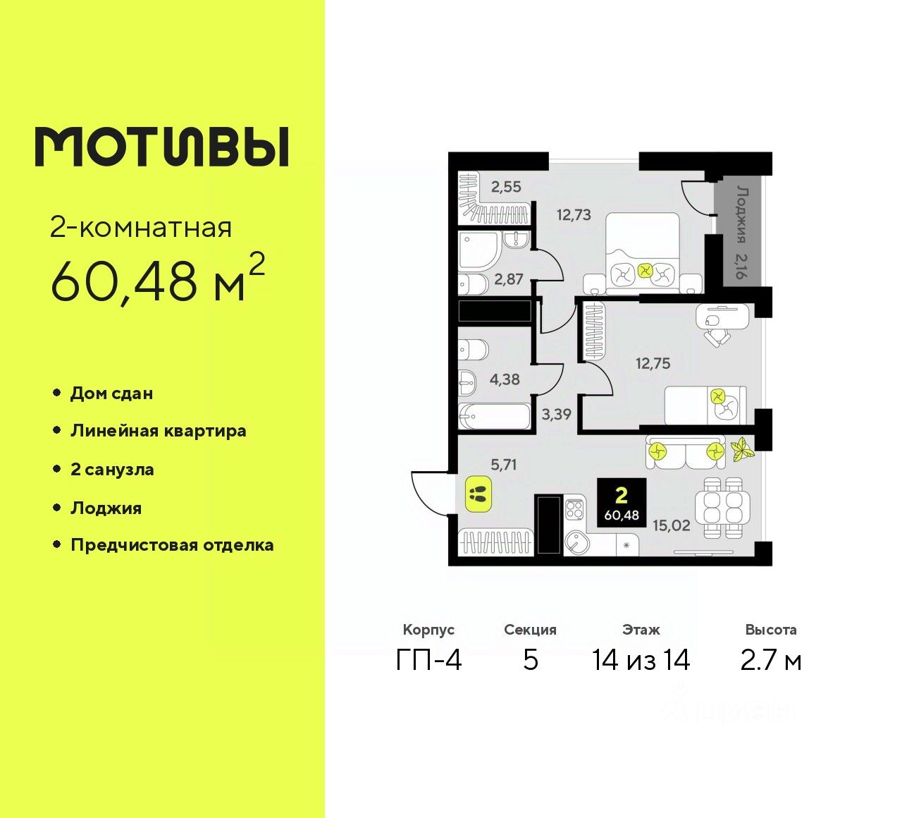 2-комн. квартира от застройщика с предчистовой отделкой в ЖК "Мотивы" на 14 этаже. Общая площадь: 60.48 кв.м., жилая: 25.48 кв.м., площадь просторной кухни-столовой: 15.02 кв.м. Комнаты изолированные, все окна выходят на одну сторону. В квартире одна лоджия, два совмещенных санузла. Высота потолков 2.7 м.