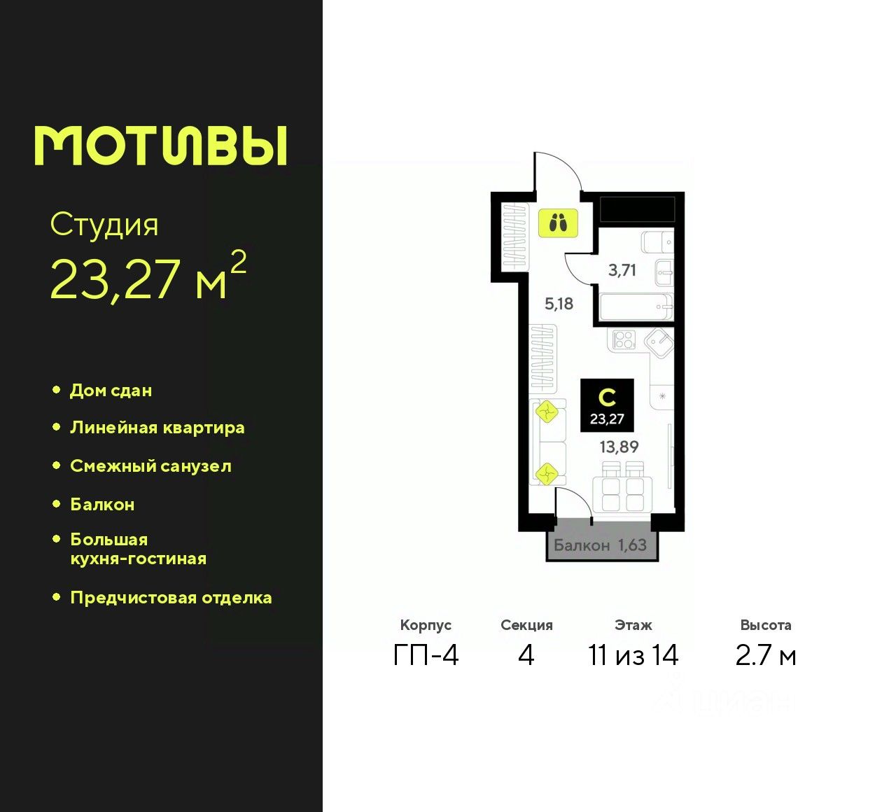 Однокомнатная квартира-студия от застройщика с предчистовой отделкой в ЖК "Мотивы" на 11 этаже. Общая площадь: 23.27 кв.м., площадь гостиной 13.89 кв.м., из которых 5 кв.м. выделено под кухонную зону. Все окна выходят на одну сторону. В квартире один балкон, один совмещенный санузел. Высота потолков 2.7 м.