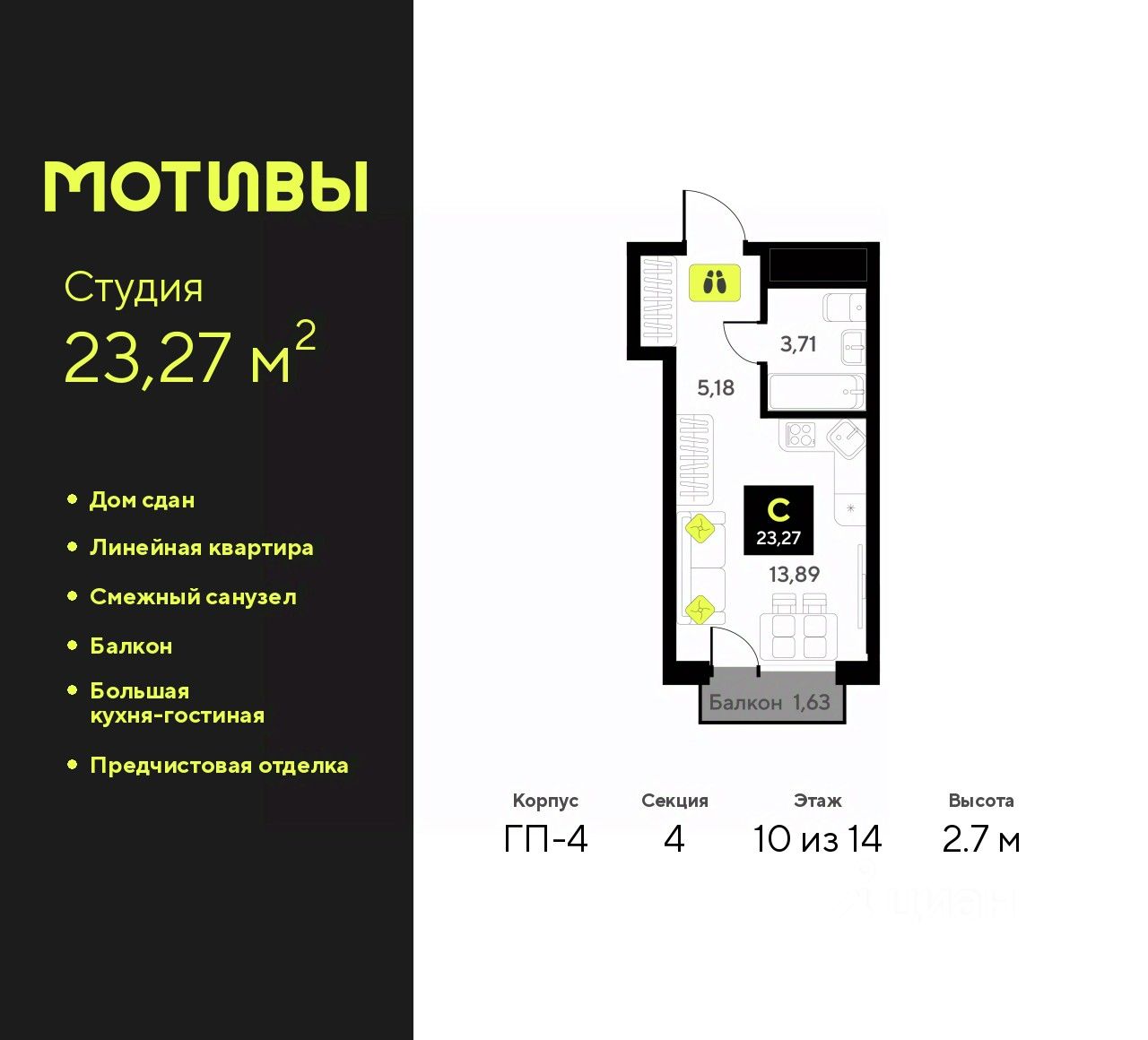 Продается 1-комн. квартира-студия с предчистовой отделкой в ЖК "Мотивы" на 10 этаже. Общая площадь: 23.27 кв.м., площадь гостиной 13.89 кв.м., из которых 5 кв.м. выделено под кухонную зону. Все окна выходят на одну сторону. В квартире один балкон, один совмещенный санузел. Высота потолков 2.7 м.