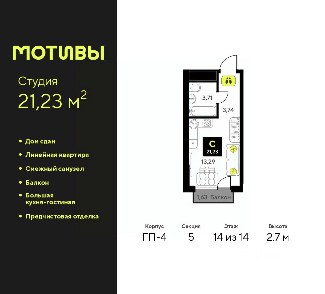 Однокомнатная квартира-студия с предчистовой отделкой в ЖК "Мотивы" на 14 этаже. Общая площадь: 21.23 кв.м., площадь гостиной 13.29 кв.м., из которых 5 кв.м. выделено под кухонную зону. Все окна выходят на одну сторону. В квартире один балкон, один совмещенный санузел. Высота потолков 2.7 м.