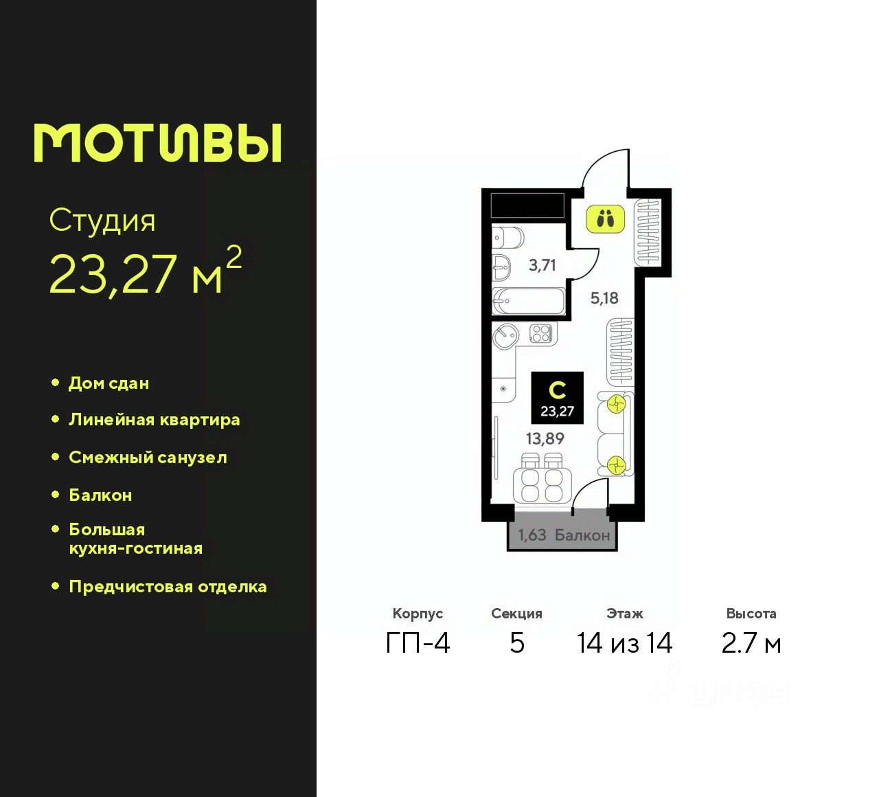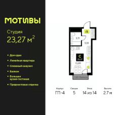 Просторная однокомнатная квартира-студия с предчистовой отделкой в ЖК "Мотивы" на 14 этаже. Общая площадь: 23.27 кв.м., площадь гостиной 13.89 кв.м., из которых 5 кв.м. выделено под кухонную зону. Все окна выходят на одну сторону. В квартире один балкон, один совмещенный санузел. Высота потолков 2.7 м.