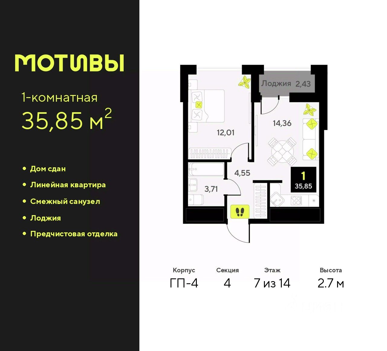 Просторная однокомнатная квартира с предчистовой отделкой в ЖК "Мотивы" на 7 этаже. Общая площадь: 35.85 кв.м., жилая: 12.01 кв.м., площадь просторной кухни-столовой: 14.36 кв.м. Все окна выходят на одну сторону. В квартире одна лоджия, один совмещенный санузел. Высота потолков 2.7 м.