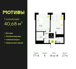 Продается 1-комн. квартира с предчистовой отделкой в ЖК "Мотивы" на 14 этаже. Общая площадь: 40.68 кв.м., жилая: 13.21 кв.м., площадь просторной кухни-столовой: 13.67 кв.м. Все окна выходят на одну сторону. В квартире один совмещенный санузел. Высота потолков 2.7 м.