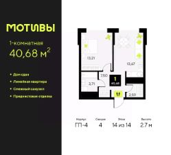 1-комн. квартира с предчистовой отделкой в ЖК "Мотивы" на 14 этаже. Общая площадь: 40.68 кв.м., жилая: 13.21 кв.м., площадь просторной кухни-столовой: 13.67 кв.м. Все окна выходят на одну сторону. В квартире один совмещенный санузел. Высота потолков 2.7 м.