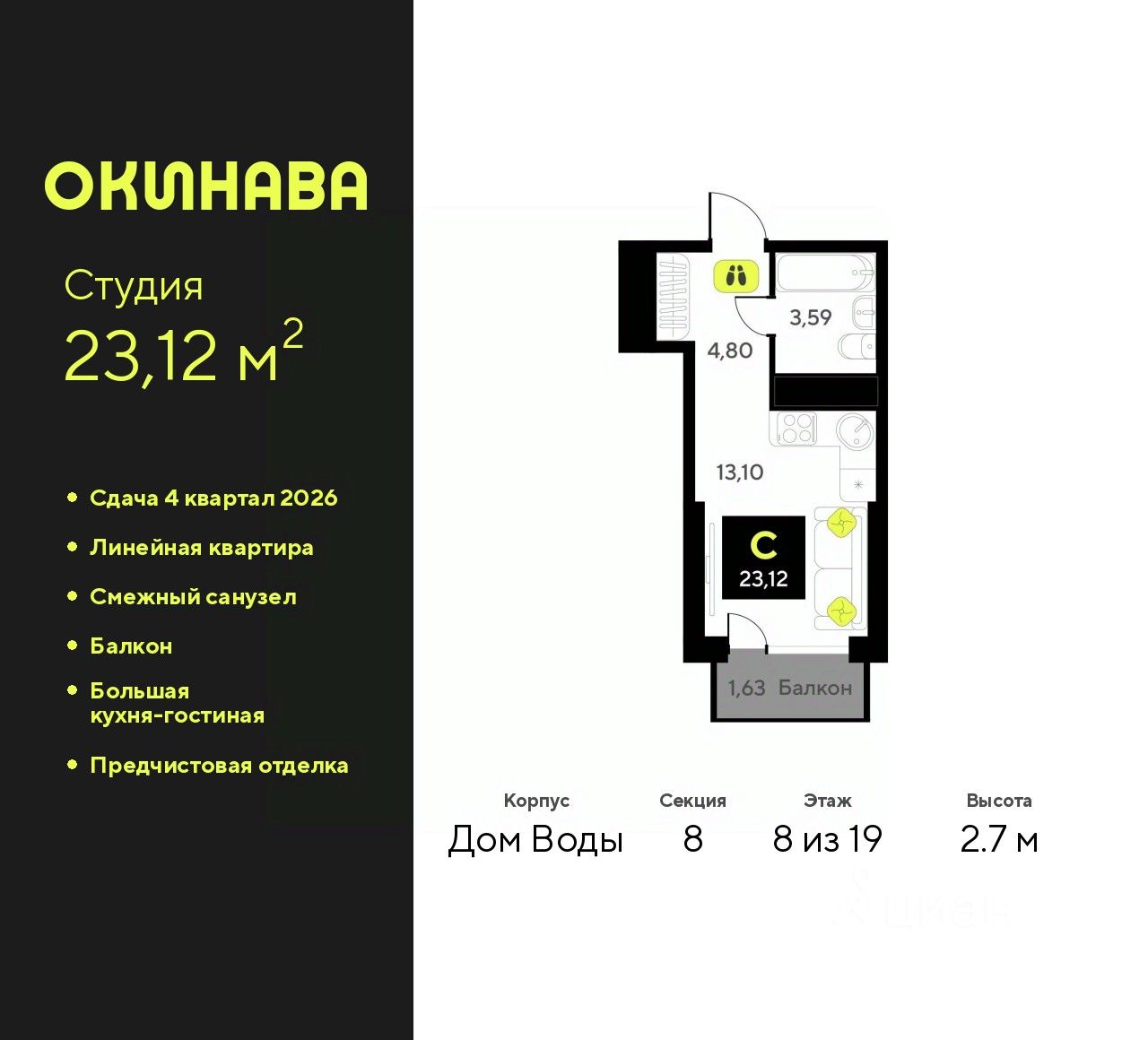 Продается однокомнатная квартира-студия от застройщика с предчистовой отделкой в ЖК "Окинава" на 8 этаже. Общая площадь: 23.12 кв.м., площадь гостиной 13.1 кв.м., из которых 5 кв.м. выделено под кухонную зону. Все окна выходят на одну сторону. В квартире один балкон, один совмещенный санузел. Высота потолков 2.7 м.