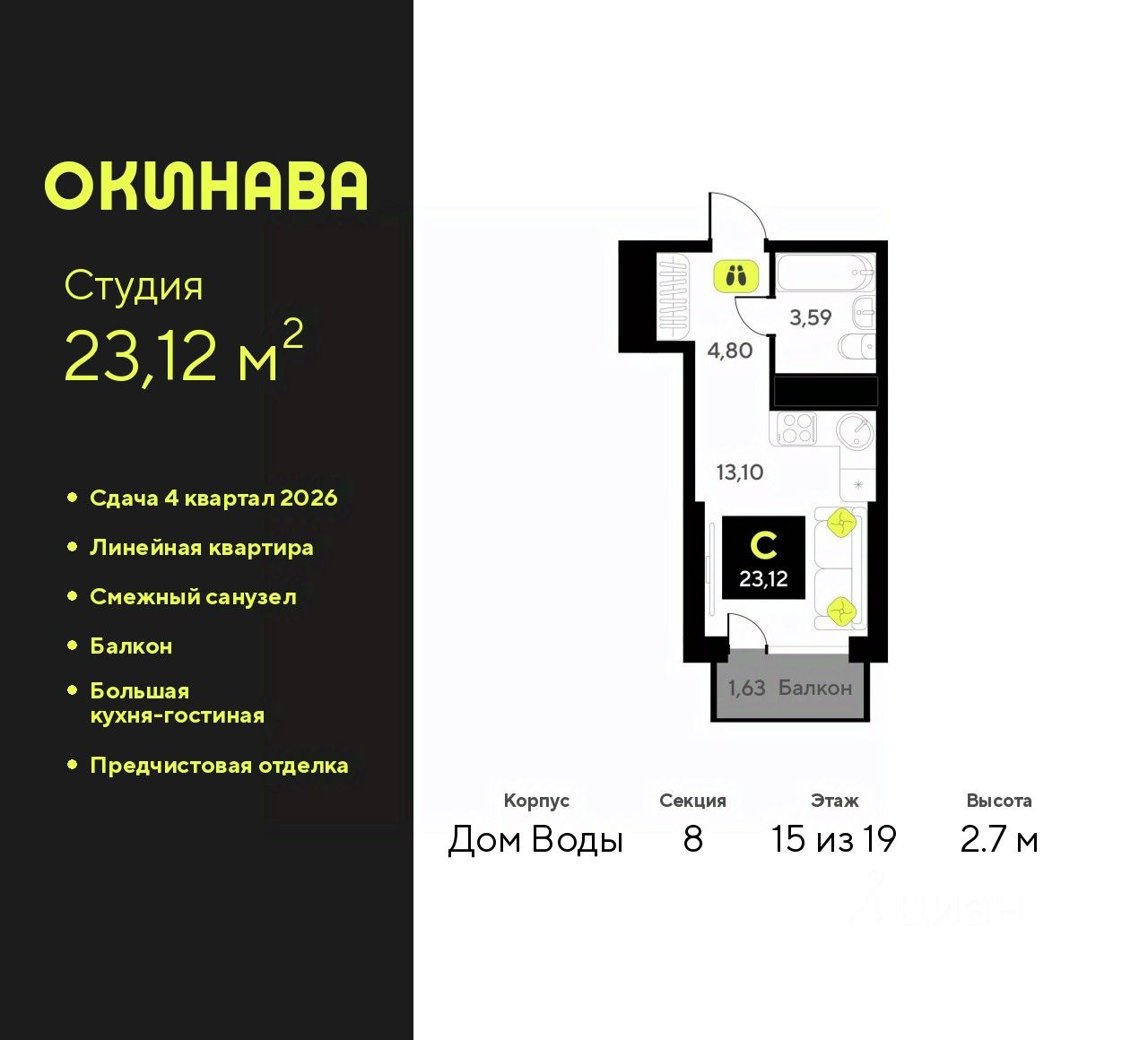 Продается 1-комн. квартира-студия от застройщика с предчистовой отделкой в ЖК "Окинава" на 15 этаже. Общая площадь: 23.12 кв.м., площадь гостиной 13.1 кв.м., из которых 5 кв.м. выделено под кухонную зону. Все окна выходят на одну сторону. В квартире один балкон, один совмещенный санузел. Высота потолков 2.7 м.