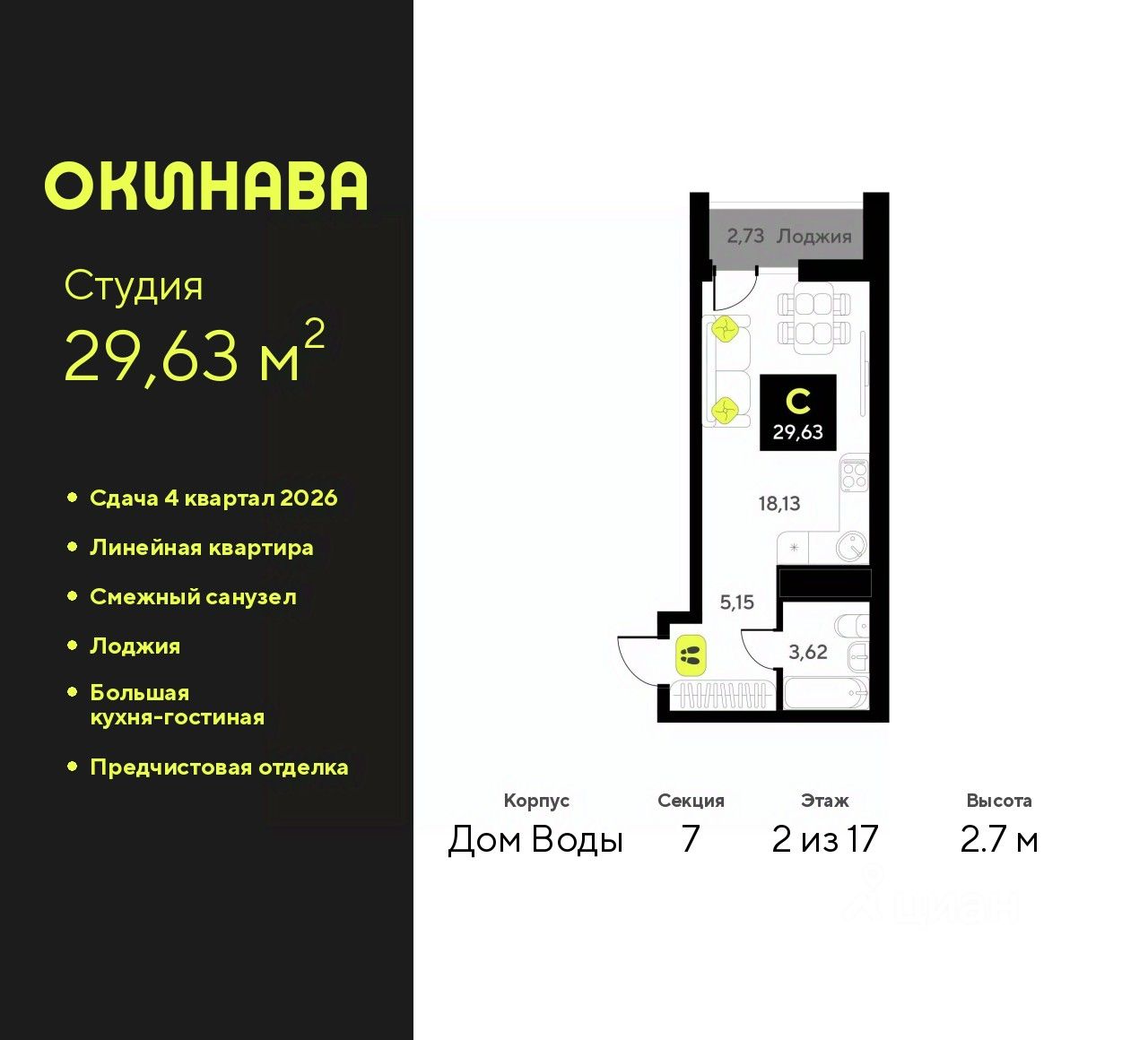 1-комн. квартира-студия с предчистовой отделкой в ЖК "Окинава" на 2 этаже. Общая площадь: 29.63 кв.м., площадь гостиной 18.13 кв.м., из которых 5 кв.м. выделено под кухонную зону. Все окна выходят на одну сторону. В квартире одна лоджия, один совмещенный санузел. Высота потолков 2.7 м.