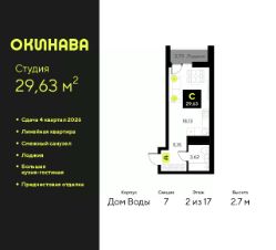 Просторная однокомнатная квартира-студия с предчистовой отделкой в ЖК "Окинава" на 2 этаже. Общая площадь: 29.63 кв.м., площадь гостиной 18.13 кв.м., из которых 5 кв.м. выделено под кухонную зону. Все окна выходят на одну сторону. В квартире одна лоджия, один совмещенный санузел. Высота потолков 2.7 м.