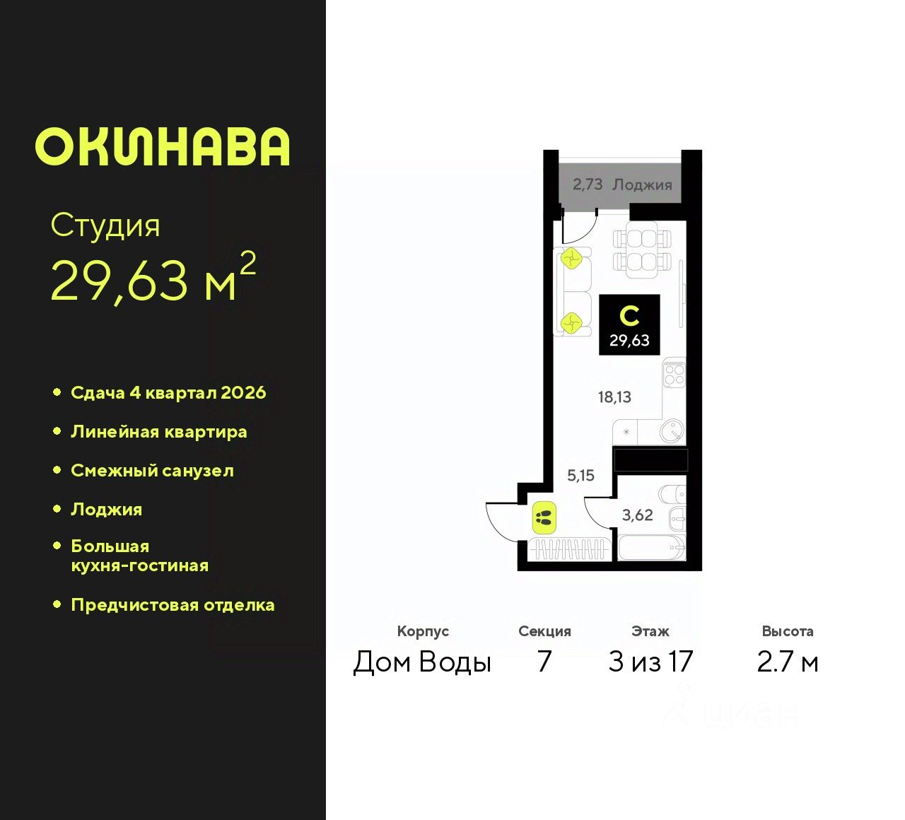 Просторная однокомнатная квартира-студия с предчистовой отделкой в ЖК "Окинава" на 3 этаже. Общая площадь: 29.63 кв.м., площадь гостиной 18.13 кв.м., из которых 5 кв.м. выделено под кухонную зону. Все окна выходят на одну сторону. В квартире одна лоджия, один совмещенный санузел. Высота потолков 2.7 м.