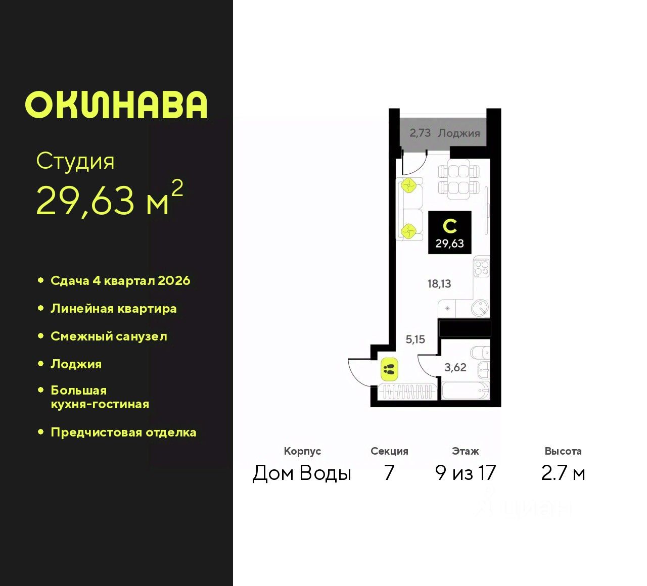 Продается 1-комн. квартира-студия с предчистовой отделкой в ЖК "Окинава" на 9 этаже. Общая площадь: 29.63 кв.м., площадь гостиной 18.13 кв.м., из которых 5 кв.м. выделено под кухонную зону. Все окна выходят на одну сторону. В квартире одна лоджия, один совмещенный санузел. Высота потолков 2.7 м.