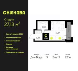 Продается однокомнатная квартира-студия от застройщика с предчистовой отделкой в ЖК "Окинава" на 2 этаже. Общая площадь: 27.13 кв.м., площадь гостиной 13.37 кв.м., из которых 5 кв.м. выделено под кухонную зону. Все окна выходят на одну сторону. В квартире одна лоджия, один совмещенный санузел. Высота потолков 2.7 м.