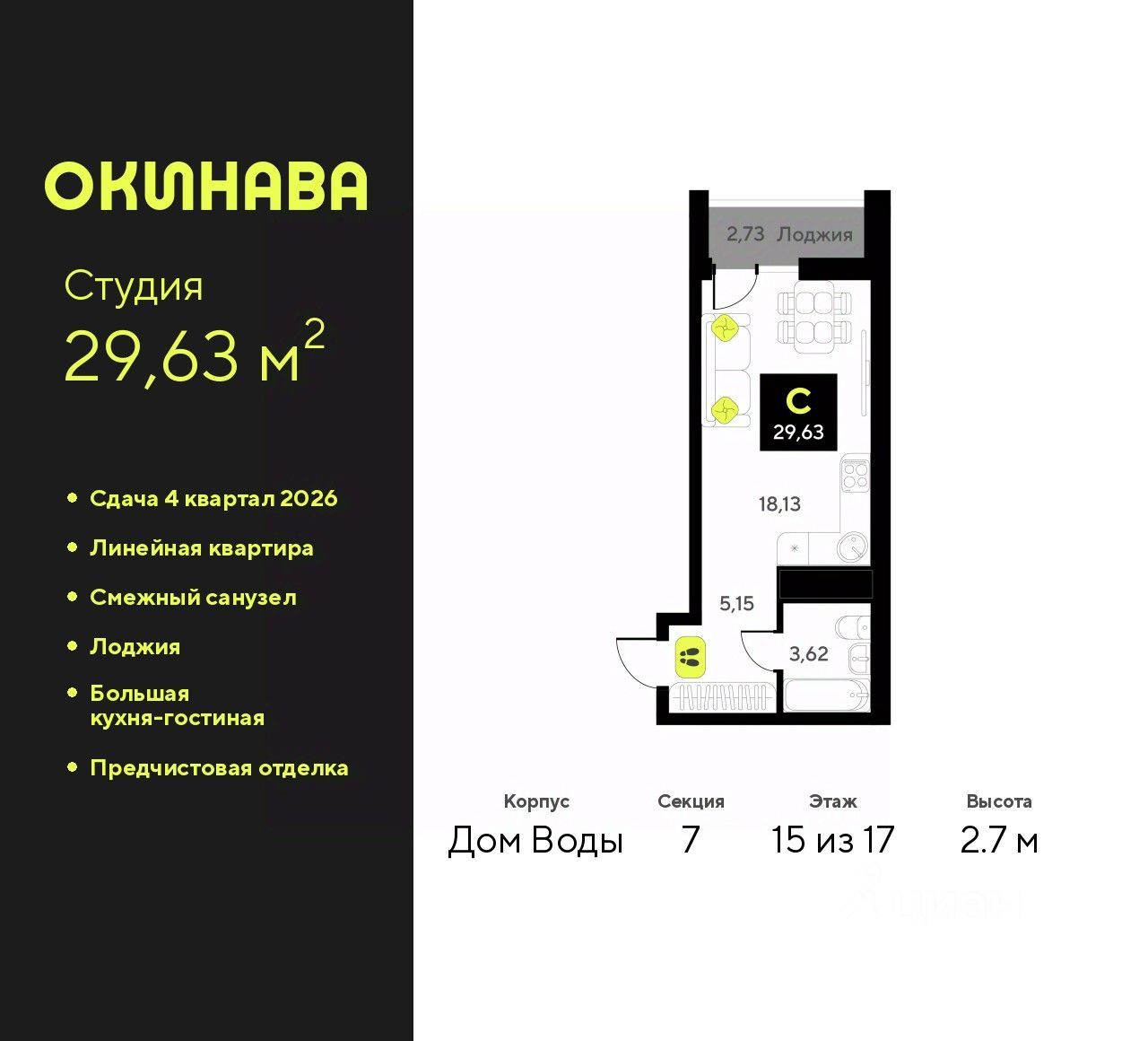 Просторная 1-комн. квартира-студия с предчистовой отделкой в ЖК "Окинава" на 15 этаже. Общая площадь: 29.63 кв.м., площадь гостиной 18.13 кв.м., из которых 5 кв.м. выделено под кухонную зону. Все окна выходят на одну сторону. В квартире одна лоджия, один совмещенный санузел. Высота потолков 2.7 м.