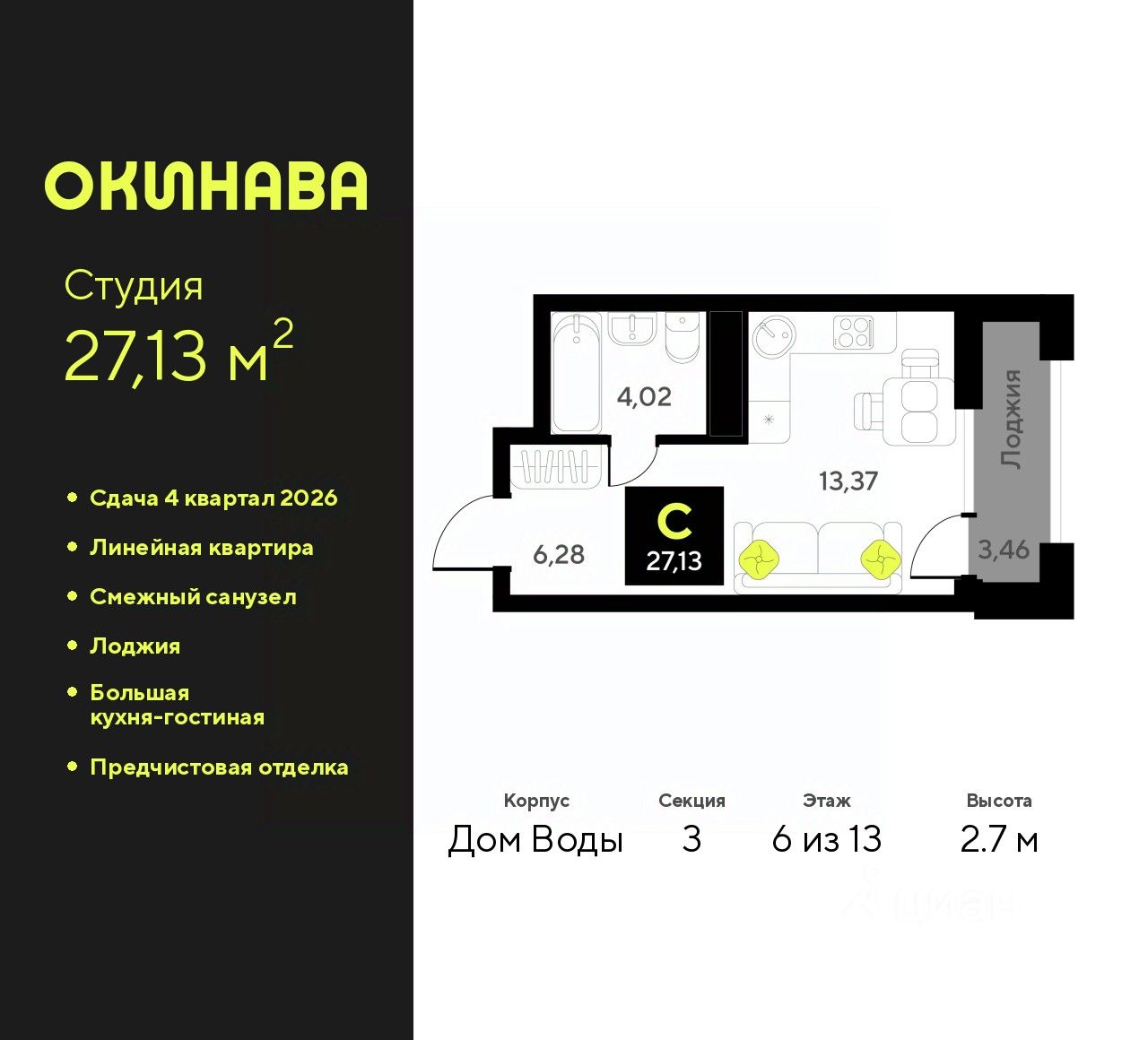 Продается однокомнатная квартира-студия с предчистовой отделкой в ЖК "Окинава" на 6 этаже. Общая площадь: 27.13 кв.м., площадь гостиной 13.37 кв.м., из которых 5 кв.м. выделено под кухонную зону. Все окна выходят на одну сторону. В квартире одна лоджия, один совмещенный санузел. Высота потолков 2.7 м.
