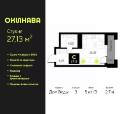 Просторная 1-комн. квартира-студия с предчистовой отделкой в ЖК "Окинава" на 5 этаже. Общая площадь: 27.13 кв.м., площадь гостиной 13.37 кв.м., из которых 5 кв.м. выделено под кухонную зону. Все окна выходят на одну сторону. В квартире одна лоджия, один совмещенный санузел. Высота потолков 2.7 м.