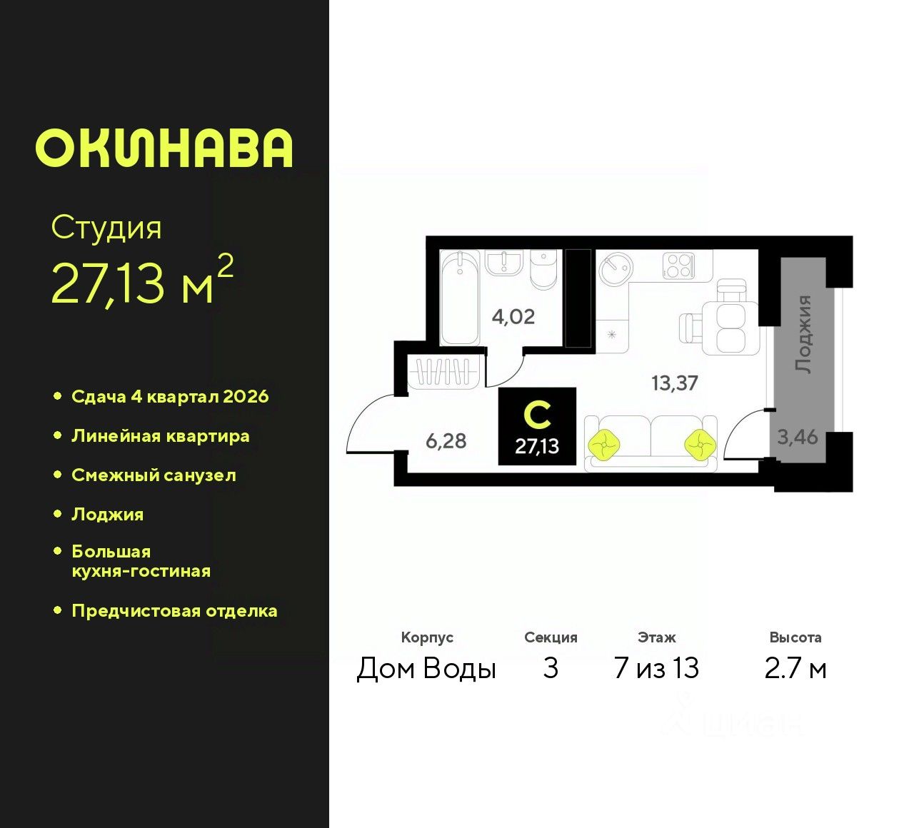 Продается 1-комн. квартира-студия от застройщика с предчистовой отделкой в ЖК "Окинава" на 7 этаже. Общая площадь: 27.13 кв.м., площадь гостиной 13.37 кв.м., из которых 5 кв.м. выделено под кухонную зону. Все окна выходят на одну сторону. В квартире одна лоджия, один совмещенный санузел. Высота потолков 2.7 м.