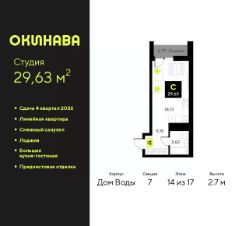 Продается однокомнатная квартира-студия с предчистовой отделкой в ЖК "Окинава" на 14 этаже. Общая площадь: 29.63 кв.м., площадь гостиной 18.13 кв.м., из которых 5 кв.м. выделено под кухонную зону. Все окна выходят на одну сторону. В квартире одна лоджия, один совмещенный санузел. Высота потолков 2.7 м.
