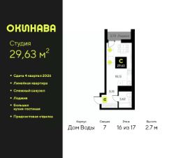 Однокомнатная квартира-студия с предчистовой отделкой в ЖК "Окинава" на 16 этаже. Общая площадь: 29.63 кв.м., площадь гостиной 18.13 кв.м., из которых 5 кв.м. выделено под кухонную зону. Все окна выходят на одну сторону. В квартире одна лоджия, один совмещенный санузел. Высота потолков 2.7 м.
