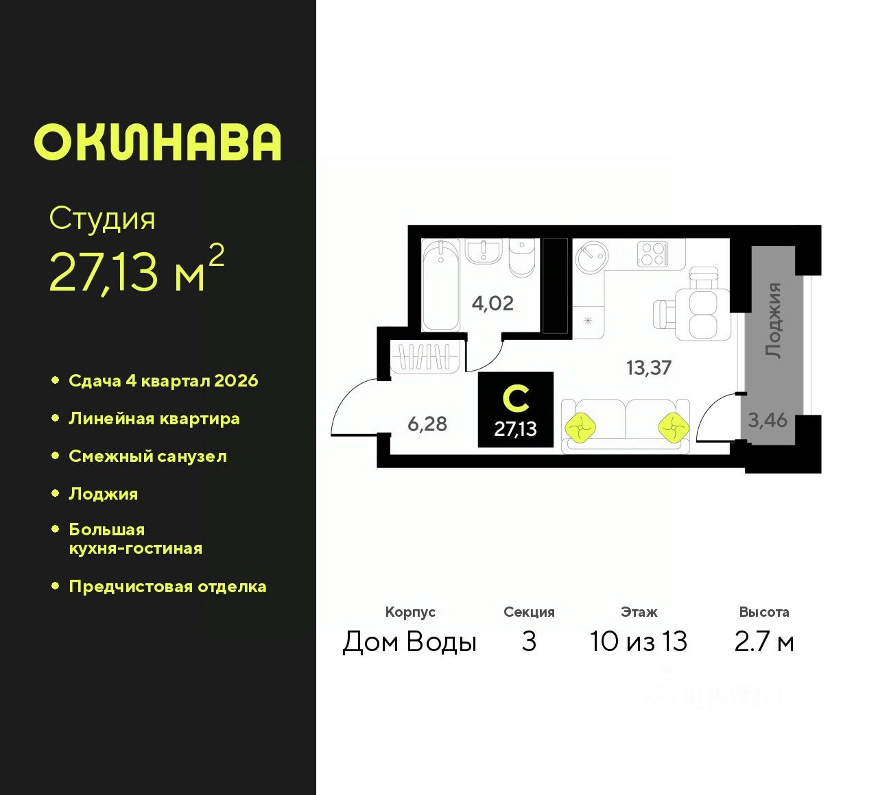Просторная 1-комн. квартира-студия с предчистовой отделкой в ЖК "Окинава" на 10 этаже. Общая площадь: 27.13 кв.м., площадь гостиной 13.37 кв.м., из которых 5 кв.м. выделено под кухонную зону. Все окна выходят на одну сторону. В квартире одна лоджия, один совмещенный санузел. Высота потолков 2.7 м.