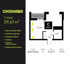 1-комн. квартира-студия с предчистовой отделкой в ЖК "Окинава" на 11 этаже. Общая площадь: 29.61 кв.м., площадь гостиной 20.69 кв.м., из которых 5 кв.м. выделено под кухонную зону. Все окна выходят на одну сторону. В квартире одна лоджия, один совмещенный санузел. Высота потолков 2.7 м.