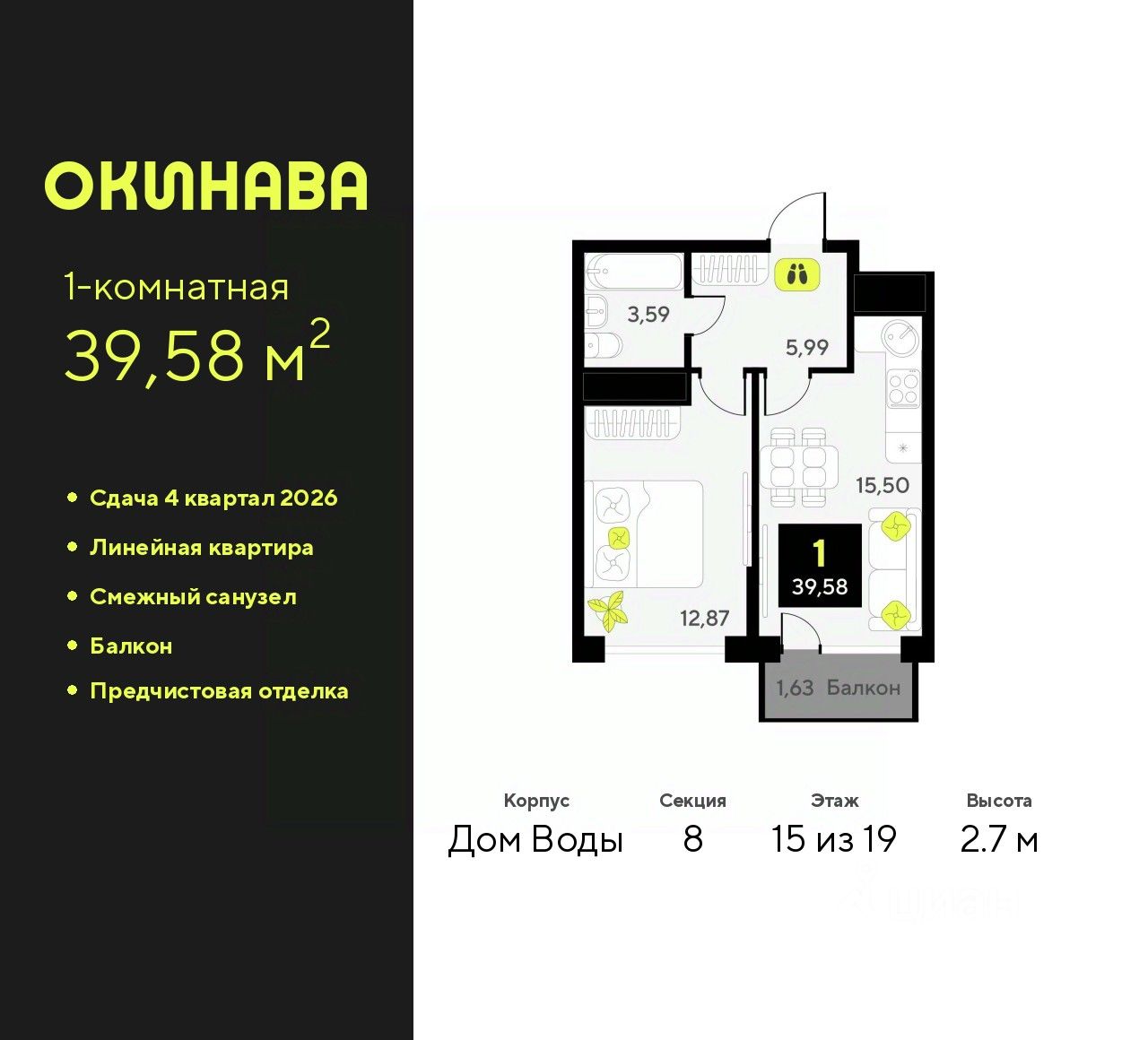 Продается однокомнатная квартира с предчистовой отделкой в ЖК "Окинава" на 15 этаже. Общая площадь: 39.58 кв.м., жилая: 12.87 кв.м., площадь просторной кухни-столовой: 15.5 кв.м. Все окна выходят на одну сторону. В квартире один балкон, один совмещенный санузел. Высота потолков 2.7 м.