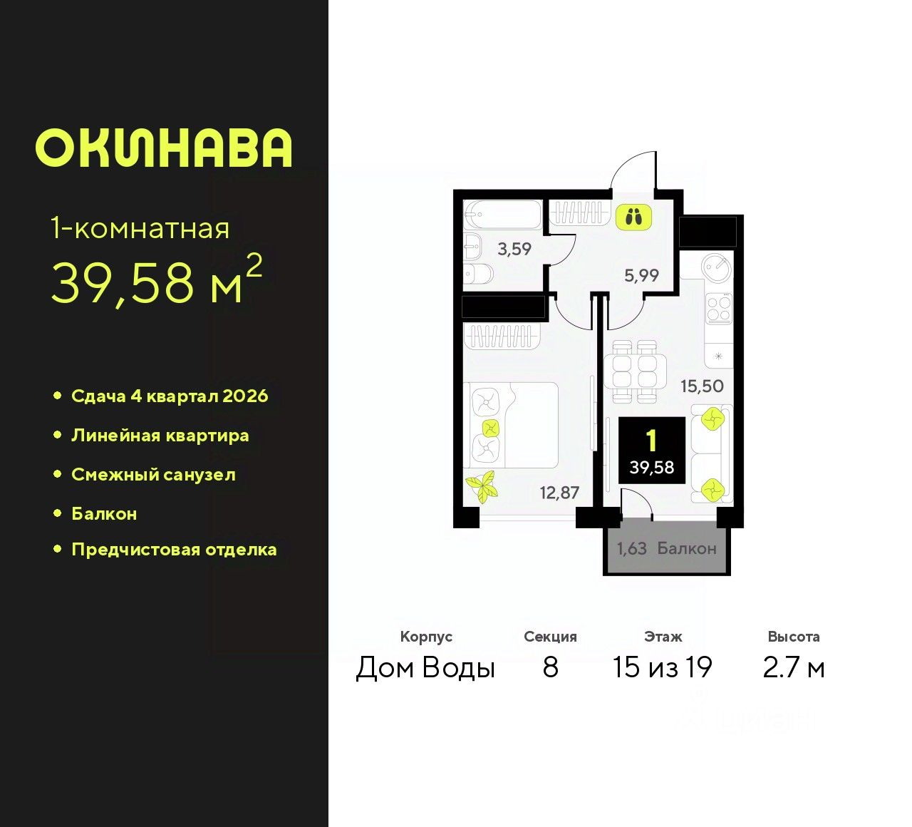 Однокомнатная квартира с предчистовой отделкой в ЖК "Окинава" на 15 этаже. Общая площадь: 39.58 кв.м., жилая: 12.87 кв.м., площадь просторной кухни-столовой: 15.5 кв.м. Все окна выходят на одну сторону. В квартире один балкон, один совмещенный санузел. Высота потолков 2.7 м.