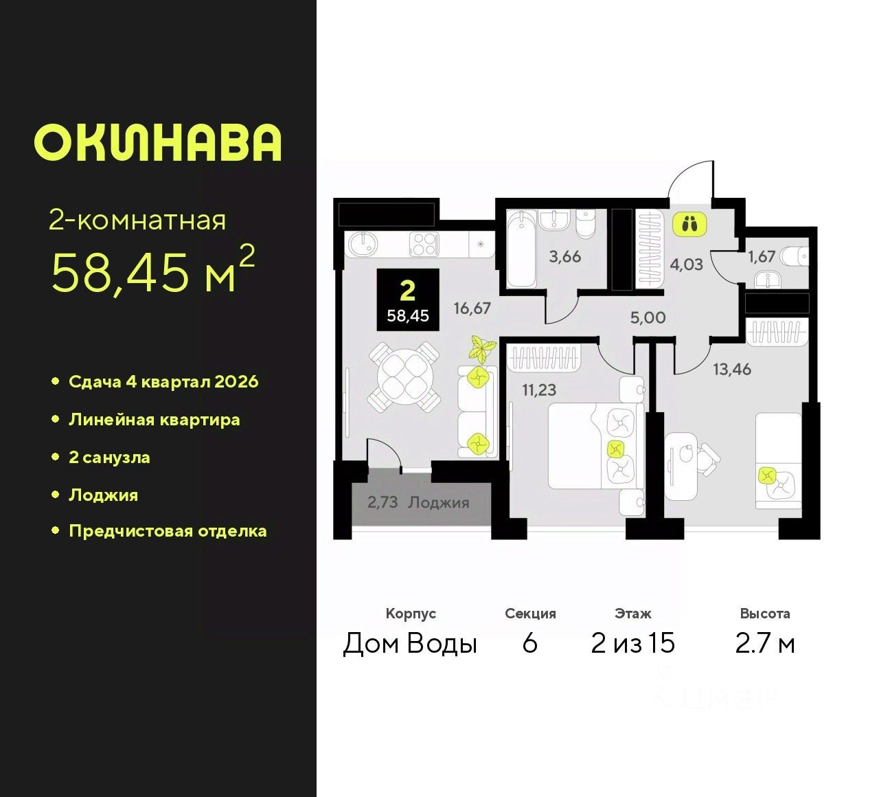 Продается двухкомнатная квартира с предчистовой отделкой в ЖК "Окинава" на 2 этаже. Общая площадь: 58.45 кв.м., жилая: 24.69 кв.м., площадь просторной кухни-столовой: 16.67 кв.м. Комнаты изолированные, все окна выходят на одну сторону. В квартире одна лоджия, один совмещенный и один раздельный санузел. Высота потолков 2.7 м.